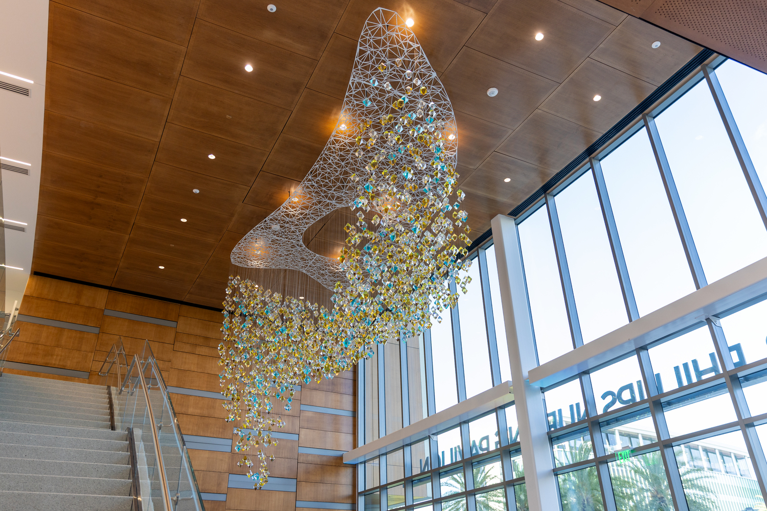 A focal point of the new building is “Vitality,” a suspended public art installation that symbolizes connection and impact created by designer and artist Brian W. Brush.